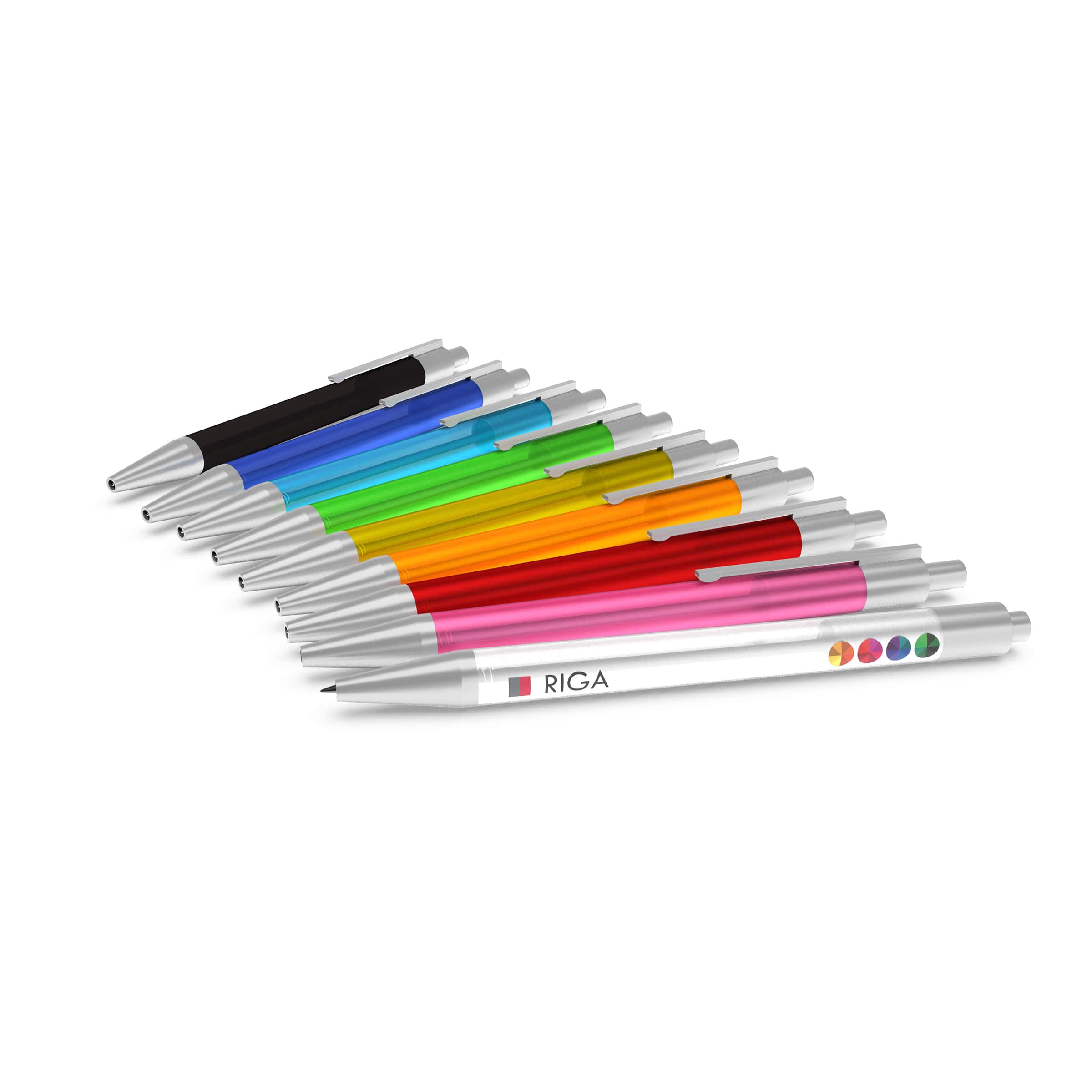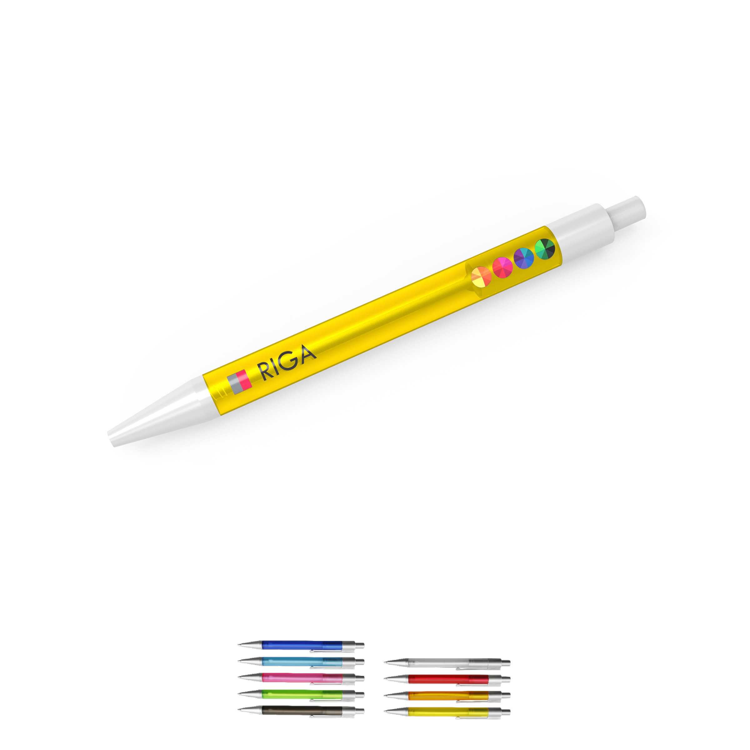 Frisse semi-transparante kleuren en een stevige plastic behuizing. De strakke belijning en de smalle, verlengde clip maken de Riga Pen tot een opvallende verschijning. Door de extra grote diameter heeft de pen een groter bedrukbaar oppervlak voor uw logo of tekst. Beschikbaar in volgende kleuren: Wit, Zwart, Cyaan, Fuchsia, Groen, Marine blauw, Oranje, Rood, Geel.