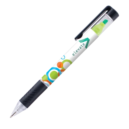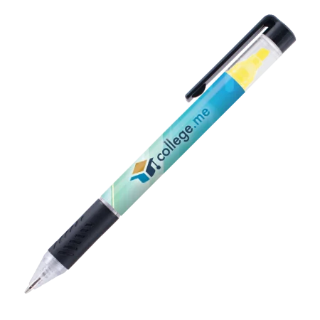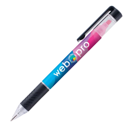 De DELOS balpen is een multifunctioneel item dat een balpen combineert met een textmarker in de kleur blauw, geel, groen of roze. De pen heeft een zwarte grip en drukker en kan full colour en 360° bedrukt worden via digitaaldruk/folietransferdruk. Merk: Peekay.