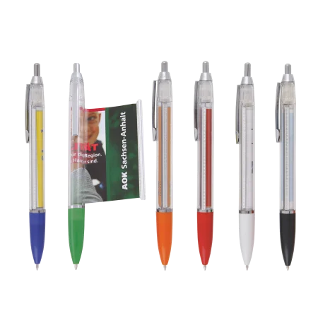 SYLT BANNER kunststof balpen Peekay. Kunststof balpen met unieke, uittrekbare banner in de transparante houder, gekleurd puntstuk en zilverkleurige clip, ring en drukker. Banner kan 2-zijdig tot in full colour bedrukt worden. Tevens is een bedrukking op de houder mogelijk. Blauwschrijvende plastic X-20 vulling. Merk: Peekay.
